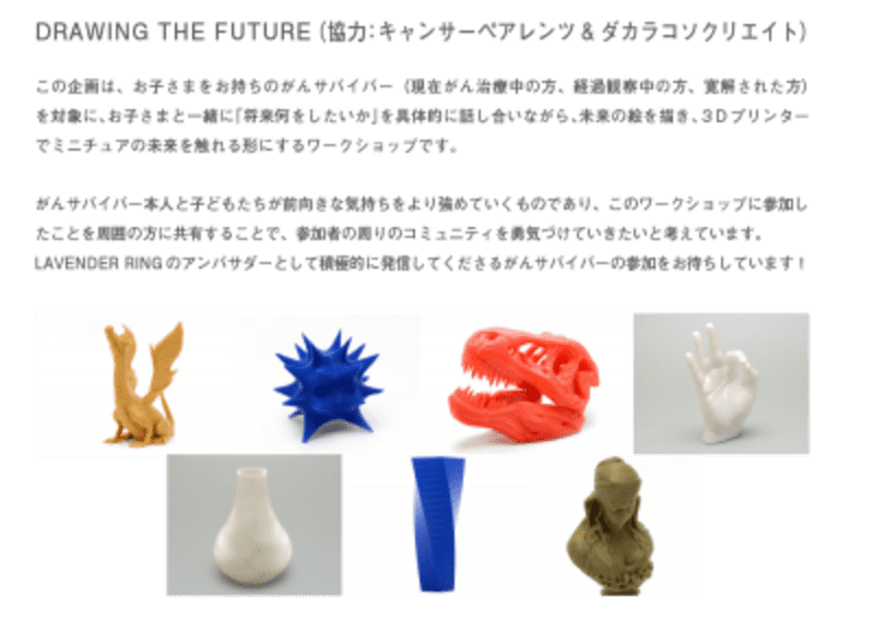 LAVENDER RING DAY 大阪開催 https://www.cancernet.jp/lavender-ring-day/ 今回のイベントではキャンサーペアレンツも協力し、「DRAWING THE FUTURE」という親子で参加できるワークショップを企画しています。お子さまと一緒に将来の話をしながら、ミライの絵を描き、それを3Dプリンターでカタチにするというものです。 ご都合があう方がいれば、是非ご参加ください。フリーアナウンサーの藤田瞳さんとリコモーションの楠雄二郎さんのトークセッションなどもあります。当日は私も会場にいますので、お会いできれば嬉しいです。 【イベント概要】 LAVENDER RING DAY 大阪 「DRAWING THE FUTURE」 ■日時:9月15日(土)13:00~ ■場所:Panasonic Center 大阪(グランフロント大阪南館) ■定員:2名/組×3組 ■応募はコチラから https://ws.formzu.net/fgen/S97684445/