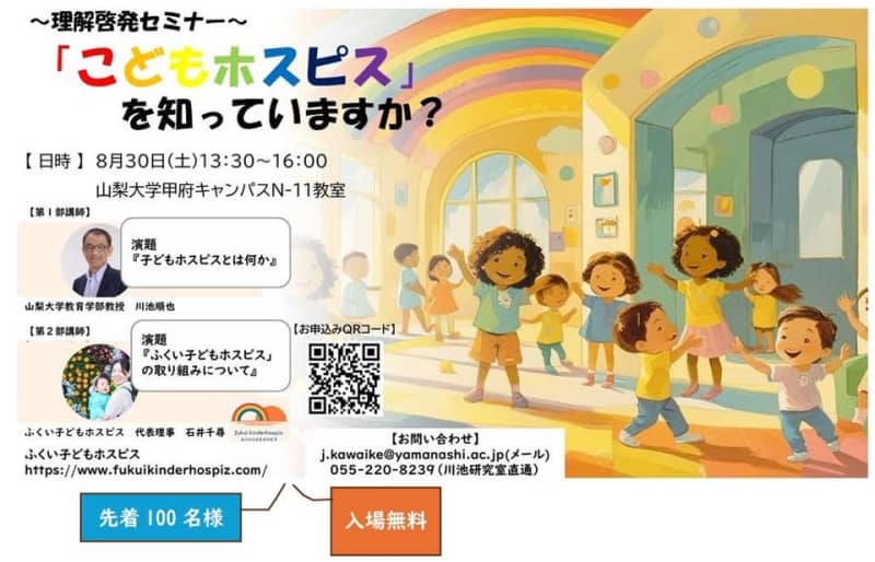 山梨大学の川池です。自身も上咽頭がんの当事者です。講義で取り上げている「こどもホスピス」の正しい理解啓発のためにふくいこどもホスピスの石田千尋さんをお招きして理解啓発セミナーを開催致します。是非ご参加ください。