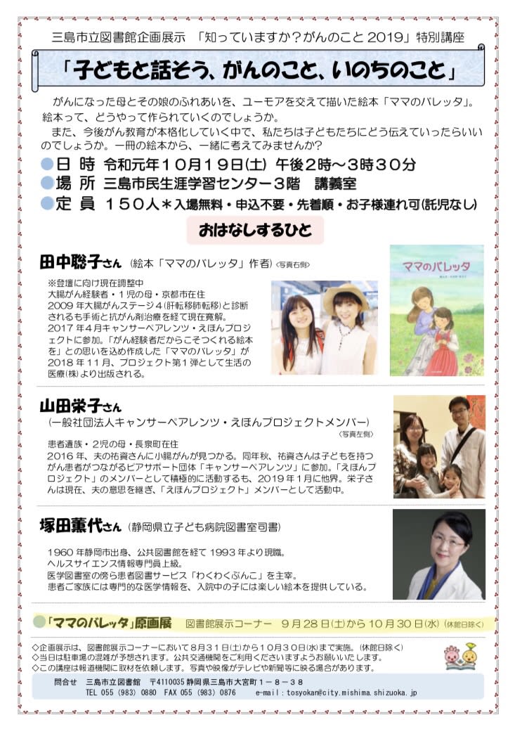 原画展に合わせて、10/19土曜日には特別講座として「子どもと話そう、がんのこと、いのちのこと」をテーマに「ママのバレッタ」の作者、たなかさとこさんを中心にトークイベントも開催されます。(入場無料・申込不要・先着順)