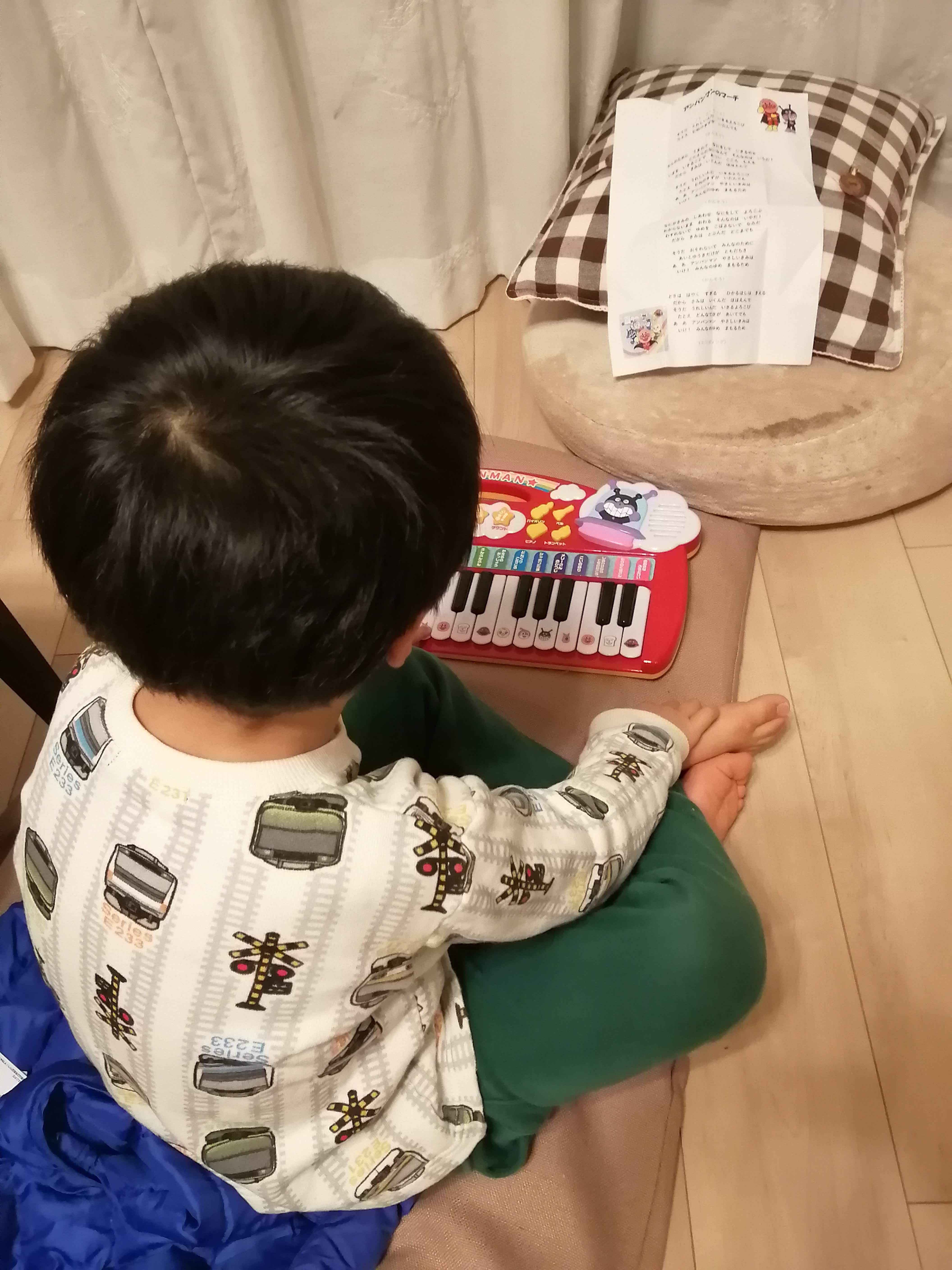 食後はNANAさんがお遊戯であそんでくれました。息子は帰宅後におもちゃのキーボートをひっぱりだして、NANAさんがくれた歌詞を見ながらキーボードをたたいてました。NANAさんにあこがれて真似してたのかな(笑) ありがとうございました。