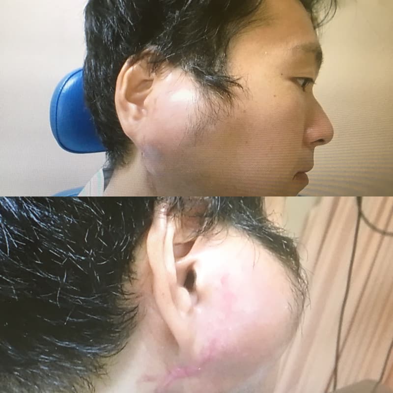ここまで腫れ上がると、腫瘍そのものの痛みの他に神経圧迫による痛み、腫瘍の方に顔の皮膚や筋肉が引っ張られて顔が動かなくなってきてました?