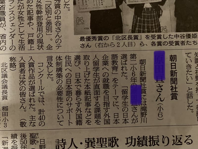 12月5日、朝日新聞朝刊18面に子どもの記事が載りました。東京都北区主催の「比べて読もう新聞コンクール」に入賞し、朝日新聞社賞をいただきました。