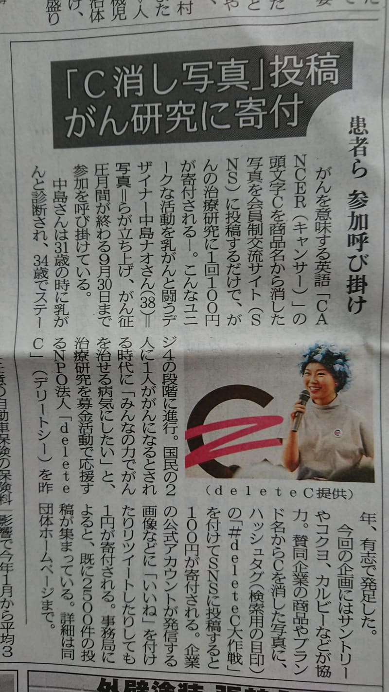 今朝の新聞記事から。 頑張ってくれているんだと元気をもらいました。 「みんなの力でがんを治せる病気にしたい」と治療研究を募金活動で応援するNPO法人「deleteC(デリートシー)」の企画。 賛同企業サントリー、コクヨ、カルビーなどの商品やブランド名からCを消した写真にハッシュタグ「#deleteC大作戦」を付けてSNSに投稿すると100円寄付。 企業の公式アカウントの画像などに「いいね」を付けたりリツイートすると1円寄付。 9月30日まで。 NPO法人「deleteC 」 https://www.delete-c.com/