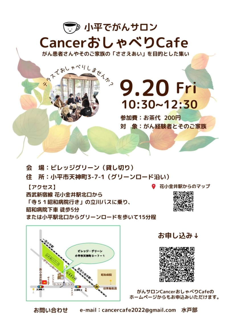 9/20(金)平日なのですが、お茶しに来ませんか?☕第13回 小平でがんサロン CancerおしゃべりCafe @ビレッジグリーン