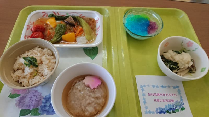 大阪府 / 胃がん / ステージ4日記 明日退院します!こんばんは。 失意の手術中止から、めちゃくちゃ傷が痛くて、特に硬膜外麻酔をはずしてからの傷み、悶絶ものでした。 が、本当に皆さんが言う通り、日にち薬でした。 今日は術後初のシャワーでした。勿論、動かすとまだまだ全然痛いですが、何もしてなければ全く痛くないし、シャワーが全く染みないのにビックリしました。人間の身体って凄いのね、そして、私、まだまだ生きたいのね、としみじみしてしまいました。 そして、写真は今日の夕食です。 可愛い!今日は特別夕食『初夏の和風御膳』ですって。 今日の昼にドセを点滴して、夕食後からTSー1が始まるので、抗がん剤前に美味しい夕食なんてラッキー?です。 今日からまた抗がん剤再開です。 新たなスタートです。 今回は、お腹開けて縫ってただ痛かっただけの、もって行き場のない悔しさだけが残る結果だったけど、でも、いいこともあったやん☺️と思える1日でした。 頑張りすぎずに、でも、頑張ろう!!と心新たにできました。 さぁ、これからもやるぞー!!