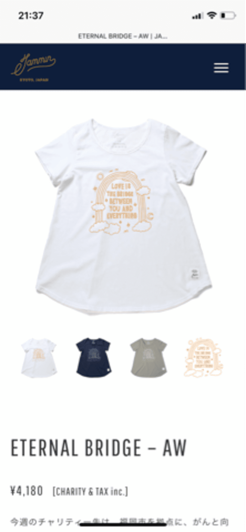 https://twitter.com/CafeCancers/status/1194541809826795520?s=20 私の友人の舞さんの活動をご案内させてください 【一週間限定‼️オリジナルチャリティTシャツ販売‼️】 応援よろしくお願いします https://jammin.co.jp/charity_list/191111-sasaetai/ ↑ こちらの紹介記事をFacebookとTwitterでシェアお願いします‼️ そのシェアや、そこに集まったいいね!の数ごとに10円が活動資金として寄付していただけます たくさんのいいねを集められると嬉しいです 今回のチャリティは全額、がん終末期の状態のお母さんが家族や子どもへの愛を形にして届けるための支援活動資金として使わせていただきます 今まさに、力になりたいご家族が数組いらっしゃいます 皆さまのご協力をお待ちしています デザインは、 “Love is the bridge between you and everything” 「愛こそ、あなたとすべてをつなぐ架け橋」という私たちの想いを込めたオリジナルデザイン 貴方のまわりの、心を込めて誰かのために頑張っている方にもおすすめの一枚です。 チャリティ販売は、Tシャツ・パーカー・スウェット・トートバッグなど色、サイズも多数揃っております。生地は全てMADE IN JAPANの綿100%❣❣ 素材と丹念に向き合う愛知県の工場で編まれ、大阪や奈良で縫製されたその生地はとても上質な肌触り( *´艸`) 首元のタグなどもなく、心地よさを追求されています!! という内容です。 私は今回、こちらをゲット!! 下にヒートテックを着ることもできるので、ゆったりしたデザインを選びました