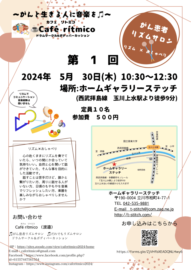 がん患者リズムサロンを開催します。 ちょこちょここちらに出没させていただいているわたしですが、実はおしゃべり苦手人間です(嘘つくなというツッコミが聞こえて来そうですが・・・) そんなわたしでもやっぱりオンラインやリアル含めていくつかの患者会に出させていただいて、いろいろな方と繋がる事ができ、心の豊かさにおいても知識においてもとても充実した時間をいただけています。 そこに音楽をプラスして、より繋がりを豊かにするお手伝いをしたいと思い、企画をしました。 がん患者である前に、みんな1人の人間です。心はがんにはなりません。リズムを奏でる事に心を持っていく事で心のがんをどこかに置いといて、1人の自分になれる時間を。言葉を介さなくても、同じリズムを共有する事で誰かと繋がれる時間を提供したいと思います。 持ち物は誰かと繋がりたいと一歩踏み出す気持ちのみ、音楽苦手、自信ないという気持ちはがんと一緒に置いてきてくださいね。音楽経験は全く問いません。 日時:2024年5月30日(木) 10:30〜12:30 場所:ホームギャラリーステッチ 東京都立川市柏町4-77-1 西武拝島線玉川上水駅より徒歩9分 定員:10名 参加費:500円 お申込み: https://forms.gle/fGJJoFSdAH1AyJnCA