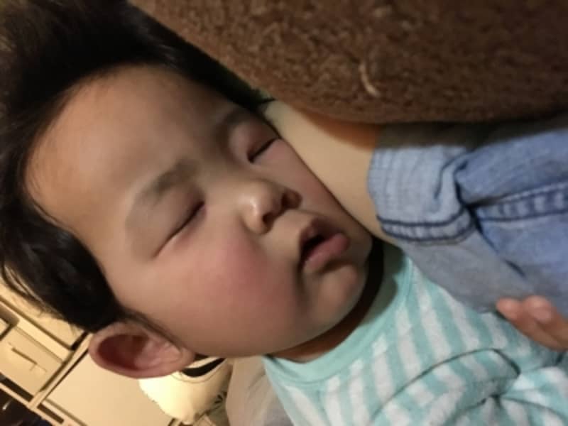 初めての事だし、弱冠楽しみにしてた私。 初日という事で夫が休みを取ってくれて、子供と3人で病院へ行く。 オキサリプラチン点滴中から腕の痺れを感じる。 途中トイレに行ったのだけど、トイレのドアノブ触って悲鳴をあげる。 病院のお会計でびっくりする。45,000円ほど。 帰りにカレーが食べたくなりココイチへ。 常温のお茶を無意識に飲みその場で吐き出す。ココイチのドレッシングも触れず、サラダは食べれなかった。 車に乗ってる途中、顔面の筋肉が痺れ出す。まぶたが勝手に閉じてくる。口がすぼんでくる。 薬を取りに薬局へ行き会計に再度びっくりする。15,000円ほど。 1クール目は朝夜ゼローダ5錠づつ、計10錠。 点滴から4日は吐き気どめを飲むので便秘になる。それ以降はゼローダのお陰で水便。トイレに何回も駆け込む。 手足の痺れは1週間続く。 寒冷刺激も1週間。 常温の物を飲み込めるまで2週間かかる。 スーパーを一周回れずカートの手すりにもたれかかって休む事が多い。 体重が2キロ落ちる。 二週間目、風邪をひく。 鼻水がすごいのでかんでいたら、鼻の下が茶紫になる。色素沈着も進む。 手足顔がどす黒くなる。 三週間目の休薬日で手が荒れ始める。 手の硬化、ひび割れ、むくみ、痛み、全て味わう。 倦怠感と、まともに家事が出来ない事にイライラする。 上の写真は安心しきった寝顔。ちょうど点滴後のためかなり痛むのを我慢した。まぁこの後すぐに腕外したけど。笑