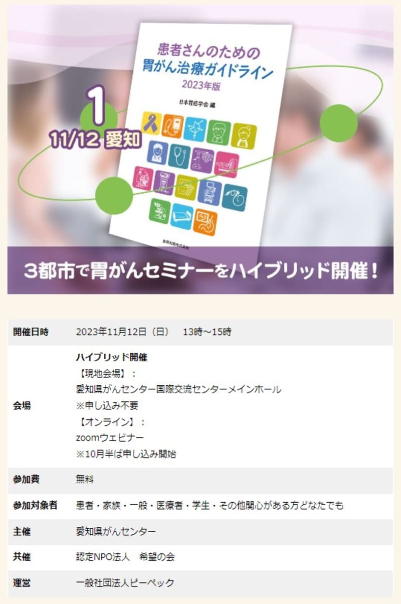 皆さま、夜分遅く失礼いたします。 また半年以上ぶりとなりますが、必要な方に届けばと思い投稿させていただきます。 (とっしーさんの投稿を見て、告知させてもらえたらと便乗させてもらいました!) 愛知県がんセンター主催による、現地/オンラインのハイブリッドイベントです。 ➀は主に胃がん患者向けですが、②「オンライン診療を活用した治験について知ろう」は がん種や地域に関わらず参考にしていただけるのではないかと思います。 日時:11月12日(日)13時~15時00分 ZOOMウェビナーを用いたオンライン形式 お申し込みは、https://us02web.zoom.us/webinar/register/WN_qBC7wtG7Q0K_SEFHbwnx3A#/registration まで。 ※共催の「認定NPO法人 希望の会」を問い合わせ先とする申込サイトへつながります。 妻も闘病中は大変なことが数多くありましたが、その際にやはり「知識がある」「質問が聞ける」 ということは、人生のコントロール感を持つためにも、とても重要だったと思います。 もし情報を必要とされる方は是非ご活用ください。 (私も運営側として当日参加しますので、何かあればお問い合わせください)