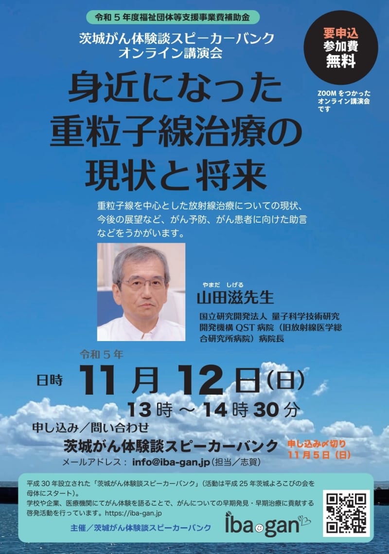 皆さま、こんばんは?? 実は私、茨城県で患者会を主宰しており、オンラインイベントを開催することになりました。 QST病院長である山田滋先生をお招きして「重粒子線治療の現状と将来」についてお話しいただきます。 日時:11月12日(日)13時~14時30分 ZOOMを用いたオンライン形式 お申し込みはinfo@iba-gan.jp まで。 重粒子線に興味のある方いらっしゃいましたら是非ご参加ください。 11月5日まで受付ております。