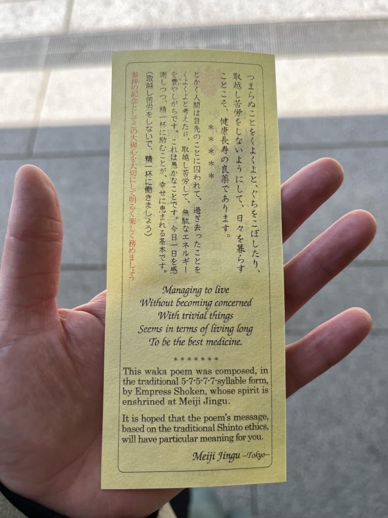先週、特に予定もなく、天気もよかったので、思い立って代官山まで行ってきました。 ずっと気になっていたパン屋さんがあり、パン盛り合わせプレートを食べる気満々だったのに、今日はやってませんと言われ、マジかよー!って叫び出しそうでした。 不定期なんて書いてないじゃーん。 まだモーニングの時間帯だったし、テイクアウトだけして近くの公園でミルクフランスとメロンパンを味見してみたら、ヤバいくらい美味しかった。 絶対リベンジ! 代官山なんて15年ぶりくらいで、何がなんでもランチしてやる!と、ピックアップしてたお店に行ってみたら、これが大当たり。 パン食べ放題がついてるんだけど、日替わりで12種類が食べられる。 どれもこれも美味しいし、リベイクされてるから温かいし、料理も美味しいし、また行きたいー。 腹ごなしに渋谷まで歩いたんだけど、ふと前日見たパワースポット特集を思い出した。 東京の第1位が明治神宮で、1駅だし行ってみよう!と。 その途中、行きたかったパン屋さんにも寄れてラッキー。 鳥居近くに近付いた時、突然Bluetoothが切れた。 音楽なんか聴いてないで、耳でも感じなさいと言われたようだった。 くぐった瞬間から神聖な気持ちになる不思議。 近くは散々通りかかっていながら、ちゃんとお詣りするの初めてだったなと気付いた。 いっぱいマイナスイオンを吸い込み、体いっぱいにパワーをもらえた気がした。 ねがいごとBOXにお願いをしたため、おみくじを引く。 明治神宮のおみくじは大御心が書かれていて、最近できてなくてダメだなぁと思っていた内容だったからびっくり。 病気になってから特に、常にこうありたいと思いながらなかなかできていないこと。 改めて背中を押された気がした。 常にポジティブでいることは難しいけれど、そうありたいと心に留めておくことは大事だと思うし、毎日少しでも達成できるようになりたい。 最初からお詣りをする予定はなかったけど、立ち寄れて本当によかった✨ 帰りは代々木方面に出たので、新宿まで歩いて電車に乗りました。 池袋からまた歩いたんだけど、18000歩程度だったので、大した距離じゃなかったんだなぁ。 でも、久しぶりに行った街を散策し、美味しいものを食べ、パワーチャージもできて、とっても充実した1日になりました。 こうしてお出かけできることは、本当に感謝すべきこと。 また行けるように、日々コツコツ頑張っていこう。