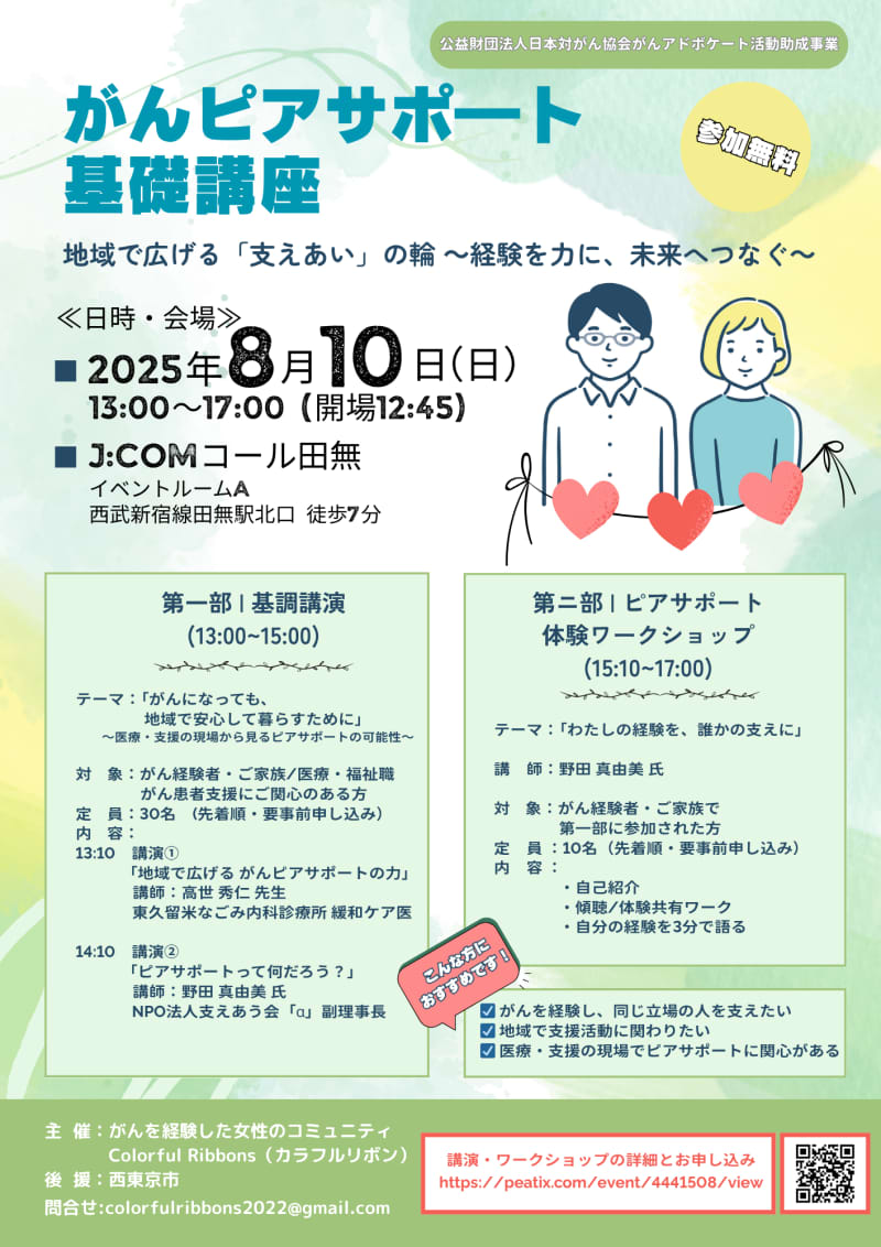 【ご案内】がんピアサポート基礎講座 in 西東京市 8月10日(日)、西東京市にて「がんピアサポート基礎講座」を開催します。 当日は、がんを経験された方やご家族の方を対象に、ピアサポートの基本を学べる講座に加えて、体験型ワークショップもご用意しています。 「ピアサポートってよく知らないけれど、身近な誰かががんになったときに力になれたら…」 そんな思いをお持ちの方に、きっと役立つ内容です。 関心のある方は、ぜひお気軽にご参加ください。 ≪お申し込み・詳細はこちらから≫ https://peatix.com/event/4441508/view