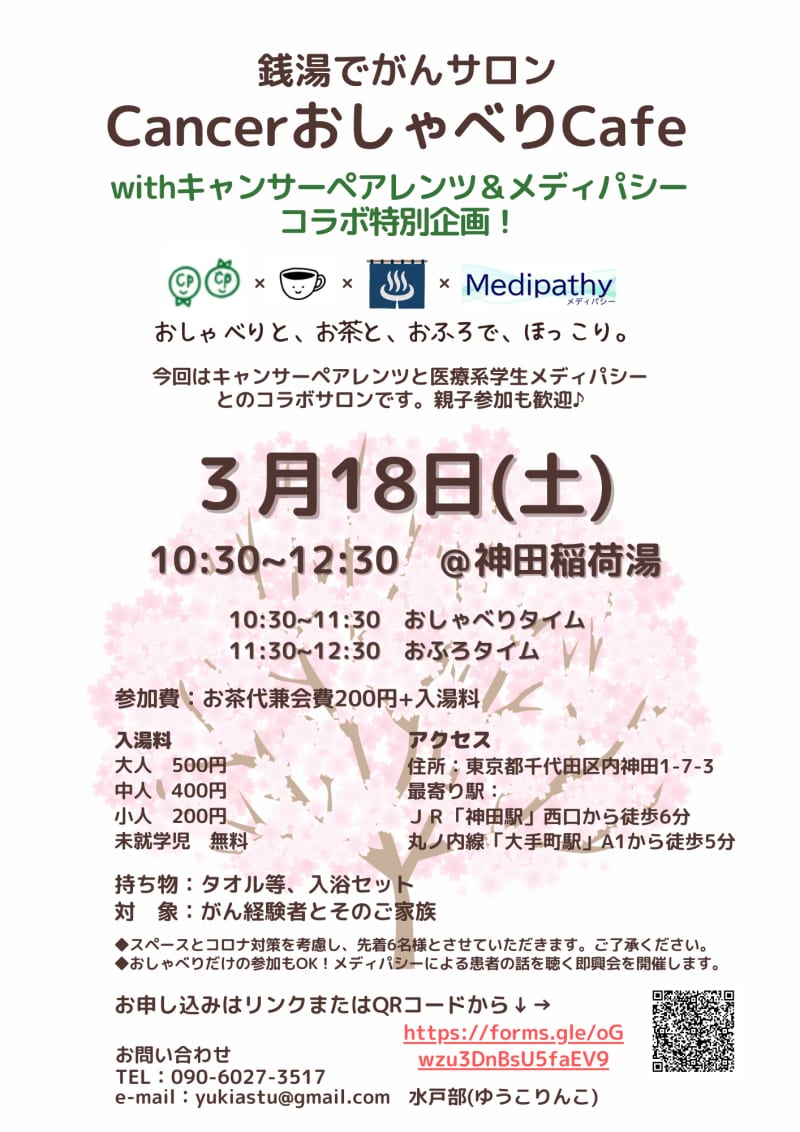 先日、呼びかけせてただいた3/18の銭湯サロン♨ 定員となりましたので、お申し込みを締め切らせていただきます。 みなさま、ありがとうございました✨ https://cancer-parents.com/posts/2122691