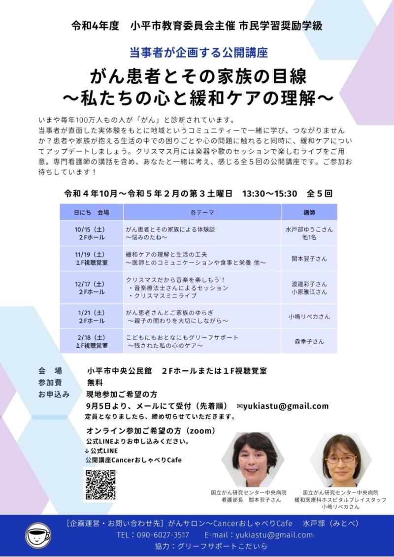 20230121 公開講座、第4回目でした? 今回は「家族のゆらぎ」をテーマに国立がん研究センターの小嶋リベカさんにお話いただきました。 がんを子どもにどう伝えるか? 私の場合、自分でうまく説明できず、一緒に病院へ連れて行き、主治医と専門家に会わせ、子どもを交えて、話をするという方法を取りましたが、まだ、がんを受け止められていなかったので、気持ちがグラグラしました。 言える本当を探す 現実に折り合おうとする ちゃんとグラグラする リベカさんのお話の中で、響いた言葉です。 この言葉は子どもだけでなく、病気だけでもない。大人も同じことだと感じました。 がんを受け入れなきゃいけないと、ピリピリしていた時期がありました。 でもそれは、現実に折り合おうとがんばっていたんだと実感しました。 過去の自分を肯定し、また一つ、気持ちが楽になりました。 会場に足を運んでくださったみなさんの熱心にメモを取りながら聴く様子。 このような機会の必要性を改めて痛感。 ご家族ががんと診断されたばかりの方が来てくれました。 どこから、なにに手を付けたらいいのか…とても不安そうでした。 勇気を出して来てくれて、とても嬉しかったです✨繋がって、支えあう場になれて、本望です。 今回はグリーフサポートこだいらの皆さんに沢山ご協力をいただき、感謝しています✨ そして、いつも頼りになるオンライン配信の要、つぼちゃん。次回は子どものためのセミナーに登壇されるとのことで、お休みですが、興味のある方はままふらっとをチェック!同じ小平市立中央公民館のイベントです。 次回は最終回。ここまで来れて、本当に感慨深いです? 2月18日(土)は「こどもにもおとなにもグリーフサポート~残された私の心のケア~」というテーマで、グリーフサポートこだいら代表の森幸子さんにお話いただきます。 次回もお楽しみに? #ままふらっと #グリーフサポートこだいら #がんサロン #キャンサーおしゃべりカフェ #小平