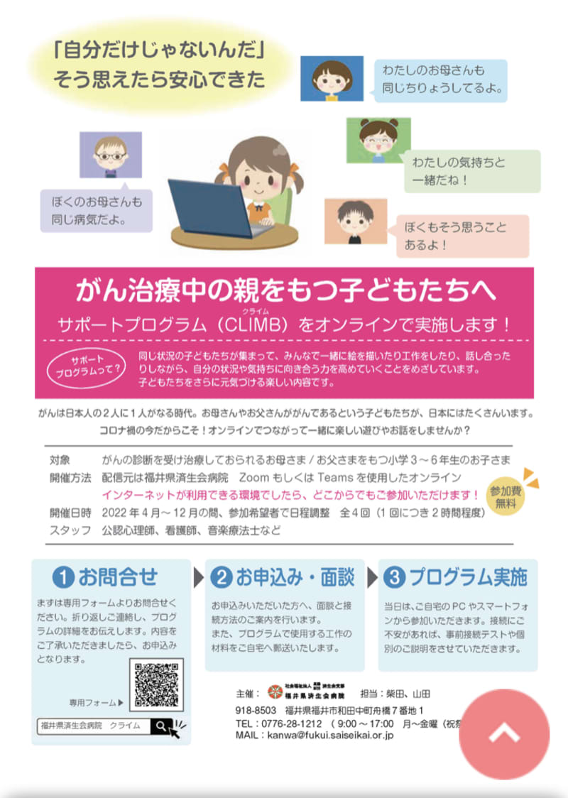 がんのワタシと子どもを丸ごと受け止めてくれる福井県済生会病院のサポートプログラム「クライム」。 https://www.fukui-saiseikai.com/cancer/info/family_support/support_program.html ZOOMだから、気軽に無料で参加できます。 心安らぐし、ものすごーく安心感を得られるプログラムなので、一人でも多くの方に参加してほしいーと思ってます^ ^。 先日、クライムのママ会がZOOMでありました! 参加者は、ママ3人、心理士さん、がん専門看護師さんの5人。 で!まさかの!ママ3人ともCPメンバー^ ^ めちゃうれしいやーん☆ がん種は違うけど、CPメンバーってだけで嬉しかったし、身近に感じたよー。 2人のCPネーム、聞けばよかったー。 もし、日記みてたら教えてー! ZOOMママ会では、クライムでの子どもの様子を心理士さんから教えてもらったり、お互い不安や悩みを話して。 子どもの会では、手術室や抗がん剤治療を、ぬいぐるみが体験する動画を、子ども達と一緒に見て、がんについて学ぶ時間もあるそうです。 心理士さん、がん専門看護師さんがファシリだから、めちゃ頼れるし、先の見えない、得体の知れないような不安感も、ぜんぶ吐き出せます。 何しろ、自分の子どもと、ZOOMとはいえ、何度も一緒に同じ時間を共有してくださってるから、子どものことをわかってもらえるという、とてつもない信頼感、安心感があるんです! この安心感はクライムならではだな。 楽しくて元気もらって、あっという間でした! 出会いに感謝です! 2022年もあと少し。 生き延びててよかったなぁ…。 あのぅ〜、 今更ながら放置していたプロフィールを書きました★