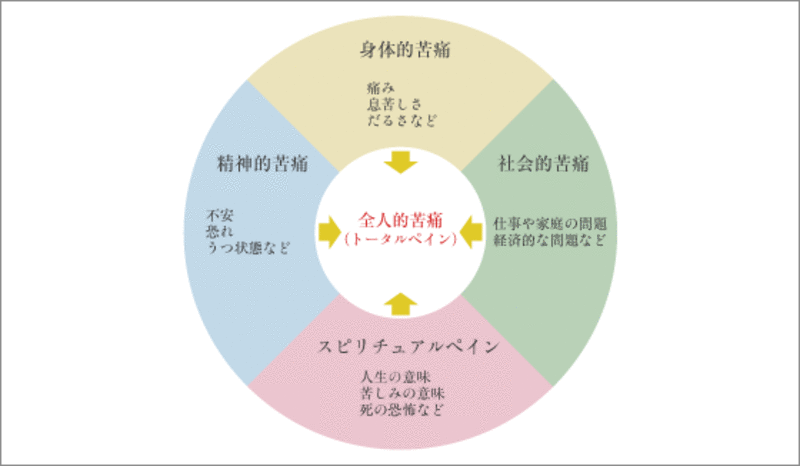 がん患者の苦痛を考える上でトータルペインという概念は欠かせないと思う。 がんそのものによる痛みや治療に伴う痛み、副作用による苦痛、倦怠感など多くの身体的不快な症状は精神的苦痛をもたらす。さらにそれらは仕事や家庭生活における制限や家族の不安は精神的な苦痛につながる。さらにこれらの苦痛は生きること、自らの人生の意味、死の恐怖などについて苦痛をもたらす可能性があります。 こんなふうに苦痛について考える考え方をトータルペインといいます。 これら四つの苦痛は複雑に絡みあっています。もし身体的な痛みが和らいだのなら精神的な苦痛は軽くなってくるだろう。 生きる意味を見いだすことができなくなるなら恐れや不安は増すだろう。 がん患者の苦痛を思うとき、本当の看護の在り方について深く問われていると考えさせられるのです。 痛みが和らぐこと。それは肉体的な痛みが和らぐことだけではなく、心の苦痛も和らぐことだと思うのです。