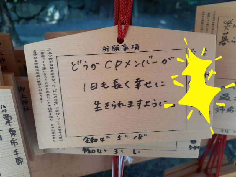 体調の良い日は散歩に出掛けます。 私の住んでいるところは田舎なので自然が多く、山を眺めながら田んぼ道を歩きます。 外は少し暑くて、でも、気持ちが良いので歩きます。 途中で氏神様のある神社に寄って、絵馬を書きました。 CPで出会った人、いつも励ましてくれる人、大好きな人、みんなのことを思いながら神様にお願いしました。 明日は今日とは違う日が来る。 私も頑張ります。