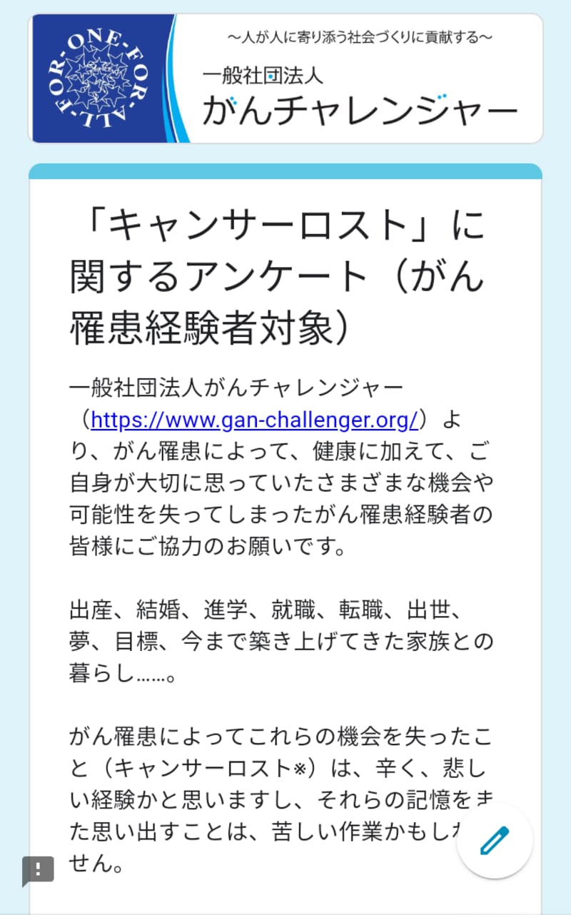 一般社団法人がんチャレンジャーとして皆様にお願いがあります。 本日は、がん罹患経験者の皆様に、アンケート(所要時間:3分程度/個人情報の記載:不要)のご依頼をさせていただきます。 私自身、4年前に中咽頭がんの治療を行い、今は経過観察をしながら、フルタイム勤務の傍ら、一般社団法人の活動をしています。 罹患前は、フルタイム勤務の職場で管理職になるという目標を持っていましたが、罹患後、その目標は遠のいていきました。 それならばと、一般社団法人を立ち上げ、活動してはいるものの、がん罹患によって失ったもの(キャンサーロスト)はそう簡単に割り切れるものではないことを肌で感じています。 そして、もしかしたら、多くの罹患経験者の方も、私と同じような葛藤を抱えていらっしゃるのではないか…と思ったことが、この企画の原点です。 今回は、がん罹患経験者の方々より、「キャンサーロスト」体験をアンケートさせていただき、内容を集約していくことで、同じような体験をされている多くの罹患経験者の方に読んでいただけるような書籍やコンテンツを作っていけないかと思っています。 出産、結婚、進学、就職、転職、出世、夢、目標、今まで築き上げてきた家族との暮らし……。 これらの機会を失ったことは、辛く、悲しい経験かと思いますし、それらの記憶をまた思い出すことは、苦しい作業かもしれません。 しかし、皆様の持つストーリーは、きっと同じような経験をした方々の力になると思います。 また、罹患経験者にかかわる方にとっても、きっとかかわる際の有益な情報になるはずです。 もしご協力いただける方がいらっしゃいましたら、以下アンケートフォームより、ご協力くださいませ。(シェアなども大歓迎です) https://forms.gle/oAuLsh1gmHc1JZDi9 どうか多くの方々のご協力をいただきたく、よろしくお願い申し上げます。 一般社団法人がんチャレンジャー 代表理事 花木裕介