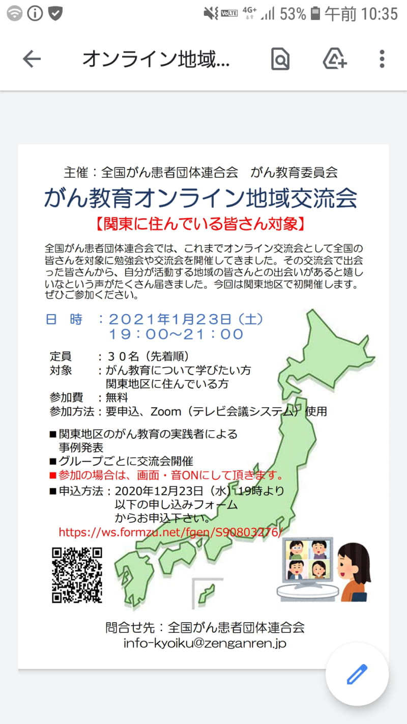 こんにちは。 息子の希望するクリスマスプレゼントがクリスマスまでに届かないことが判明し、息子に「サンタさんは海外から来るからコロナの影響で2週間の隔離期間があるんだよ」と毎日社訓のように唱えているとっしーです。 さて、先日CPでも「がん教育」イベントをオンラインで開催しましたが、全がん連(全国がん患者団体連合会)でも関東地区限定にはなってしまいますがイベントを開催する情報をキャッチしましたので、皆さんに共有させていただきます。 【日時】2021年1月23日(土)19時~21時 【内容】事例発表など 【申込】 https://ws.formzu.net/fgen/S90803276/ 2020年12月23日(水)19時から受付 全がん連さんのイベントは人気があり、実は前回1日受付開始を勘違いしたら見事「sold out!」になってしまった経験があったため、皆さんに告知させていただきました。 この日は昼間にCPでも「がん教育」のイベントをやるという噂もあるような… 是非興味のある方いらっしゃいましたらご参加ください!