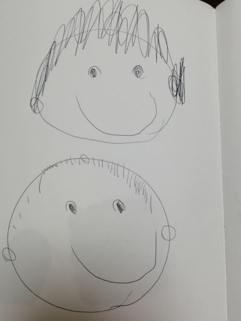 写真は、娘が描いてくれた娘と息子です。息子の髪の毛がまだ薄いところもそっくり☺️娘が描いてくれる絵は、いつもニコニコしていて、なんだかほっと、癒やされます。描いてくれた絵は全部とってありますが、私の宝物です。