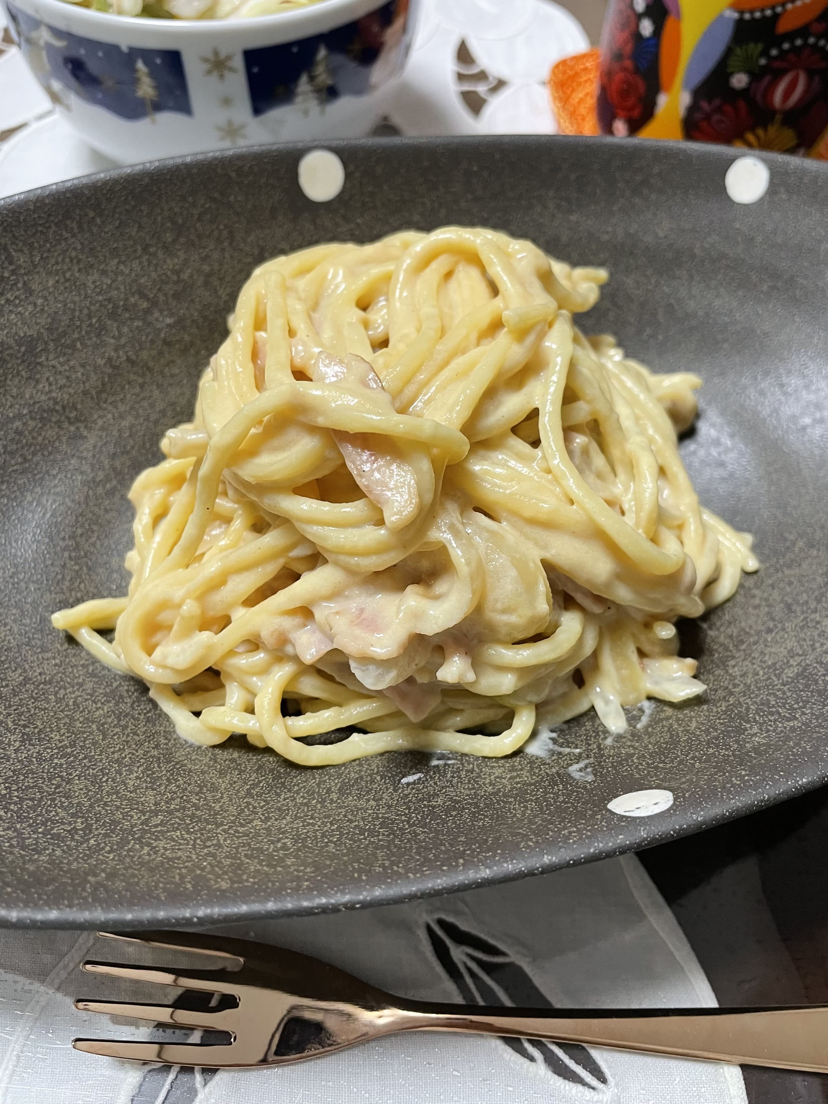 有り合わせの素材とフェットチーネでカルボナーラ風パスタです。
