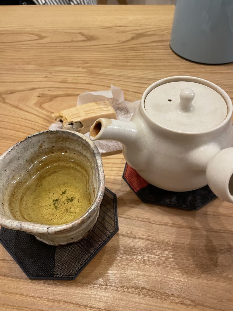 CP飲み会でお土産にもらったお菓子を食べながら、お茶を飲んでいる。