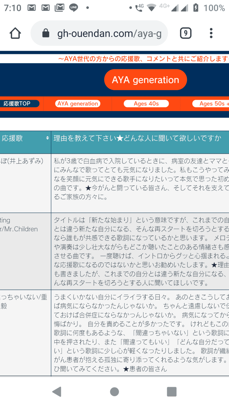 参加くださった皆様本当に有難うございました! 一般社団法人がんと働く応援団で アンケート形式でがんになった方や、 周りでサポートしてる人に教えてもらった その人達が辛かった時力をくれた音楽の数々とメッセージを公開しています。 今コロナに立ち向かっている人達にも ぜひ聞いて欲しい。 そんな素晴らしい曲が沢山集まりました。 https://www.gh-ouendan.com/ouenka