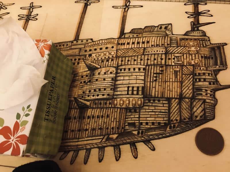こんばんは手術終わりました。 私は骨巨細胞腫、右膝の骨の腫瘍を除去、 腰の骨を移植しました。 足より腸骨のほうが痛みますが。 今 店を閉めてて 開店したら 展示を飾ろうと計画してます。 ジブリの大博覧会 インパクトのある空飛ぶ機械展 その飛行船 今 描き込み中。 入院の時間がある間 とにかく描き込みつくります。 また入院ライフ更新したいと思います。