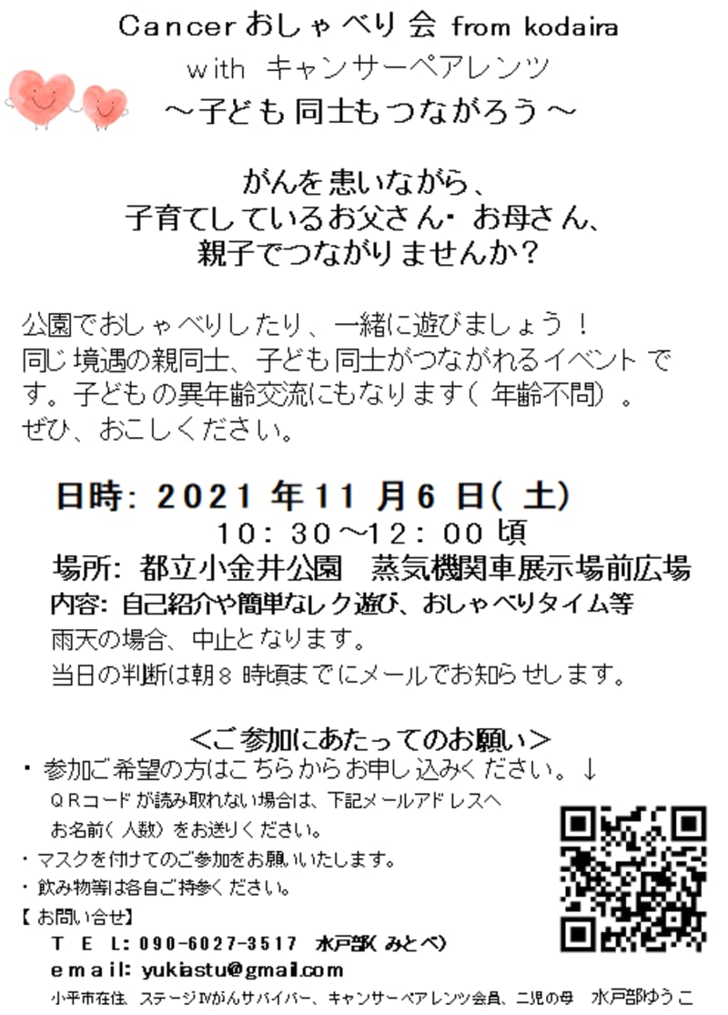 気になっていることは元気なうちに自分の目で、肌で、確かめなくては✨ 近くに子育て中のサバイバーさんがいたら、つながりたい!子供同士もつながらせたい! だから、思い切って!地域はこじんまりと!やってみることにしました。 東京都小平市・小金井市近辺の子育て中のがんを患うパパ&ママ、一緒に過ごしませんか? キャンサーペアレンツ会員の方も、そうじゃない方も、地域でつながれたら、大きな安心や支え合う力になるんじゃないかと思うんです❣️ (今回のイベントに向けてご相談させていただいた、キャンサーペアレンツさん、地域の各団体や支援の方々、本当にありがとうございます。ここからは当日まで流れていくのみです?) 少数ですが、ポストカード(案内状)を小平市内の公共の施設に置かせていただきました。まだ個人的な活動になるわけで…どんな人がやっているか、分からないにもかかわらず、市民向けに置いていただけました。門前払いかと思っていたのですが。人って温かい? 内容に共感してくれたのかな✨ 親子でのご参加、お待ちしています? ご参加はこちらからでもOKです→ https://docs.google.com/forms/d/e/1FAIpQLSfsnnDlN6fDya-uiaQ7jFY5HrJ1WeHLs65kAzulAnf8gltC5w/viewform?usp=pp_url