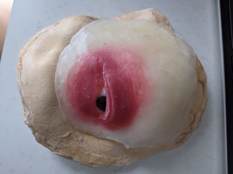 写真に不快を感じたら申し訳ありません。 いよいよエピテーゼ製作が始まった。 初日、顔の型取り(土台用)と写真撮影。 1回目:1週間後写真を元に蝋で制作したエピテーゼのモデルを、顔に合わせて彫刻。 職人さん(女性)が一人で土台に乗った蝋のモデルをスプーンで削ったり新たに蝋を載せたりを繰り返し、その都度顔に貼付けてチェックの繰り返し。 出来上がり(1枚目写真、65%とのこと)を家に持ち帰ってモデルを装着して家族から意見収集とセルフチェック。 2回目:家族意見などを元にモデルの修正彫刻とチェックの繰り返し。 出来上がり(2枚目写真、75%とのこと)を家に持ち帰って再度家族から意見収集とセルフチェック。 細かい修正箇所を発見(家族に感謝)。 自分自身が納得できるまで何度も修正しましょうとの職人さんの言葉をいただき、色々な角度で自撮りしてチェック。 3回目:色々と修正を加えていたところ、涙袋を追加してみることに。無機質だったモデルに命が吹き込まれたかのように変化した。 これだ。これならいけそうだ。(3枚目写真) 帰宅して家族に見てもらうと、「っぽくなった!」と。 確かに以前の顔っぽくなった。 これでエピテーゼの原型が決まりそうだ。 今までの憂鬱が晴れた様な気がした。 職人さんの優しさとひたむきな姿勢に感謝しかありません。