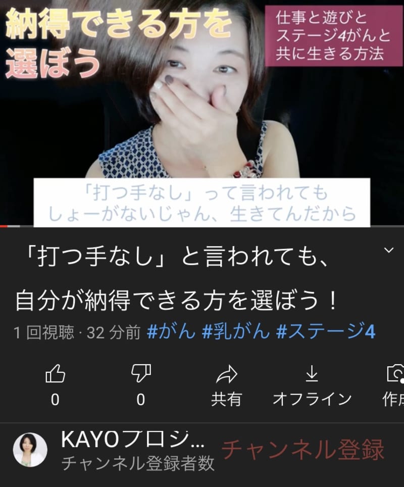 こんばんは。 せとちゃんです。 思うところあって、今日から抗がん剤のハラヴェンを再開しました。 再開というか、もう1年経ってるので、再チャレンジです。 先週、ゲノムパネル検査の結果が「打つ手なし」って出て、 その翌日から腫瘍熱に悩まされて、 発熱したもんだからコロナを疑われて、あちこちの病院ではバイ菌扱い? PCR検査を2度もされて、2度も陰性の結果が出て、 でも体の痛みがきつくて、ナイキサンで腫瘍熱を下げて、 先生に「このまま死ぬのはしんどいな。ハラヴェン、もう一度やってみようと思うんです」と提案して、今日からやることにしました。 ハラヴェンをやろうと思った理由は以下の通りです。 ・ゲノムパネル検査で異常が見つかった3つの遺伝子に合う薬はないとされたものの、昨年に肝転移が消えた直前までやっていたのはハラヴェンだった ? あれ?ハラヴェン効いてたんじゃね? ・主治医は知らなかったけど、ハラヴェンによる手足のしびれと痛みはセカオピの有明の高野先生による助言で、メチコバールで改善した。 ? 主治医が知らなかっただけじゃね? メチコバールを服用しながらハラヴェンやってれば何とかなるんじゃね? というのが大きな理由です。 この数週間で思うことがいっぱいあったので、今更ながら、YouTubeに動画を作ってアップしようと決めました。 何か楽しいことやりたくて。 思い立ったが吉日! 今日から! そんなわけで、ストックの動画や写真のみだし、テロップの入れ方とか下手ですが、第一弾をアップしました。 これから私が話している動画もやっていきます。 今回の動画はこちら。 https://youtu.be/msqrBcky7XE チャンネルは、放置状態だった「KAYOプロジェクト」のチャンネルを使うことにしました。 (私のかつての動画プロジェクトは、私のプロフィールを読んでくださいませ) その後の私がどうなったかを知りたい人もいるだろうし、せっかく仲間が作ってくれて、登録者が100人ほどいるのに、活かさないのものももったいないし。 暇な時に見てってください。 私、せっかちなため、人の時間を奪うような長い動画は上げない予定ですのでw